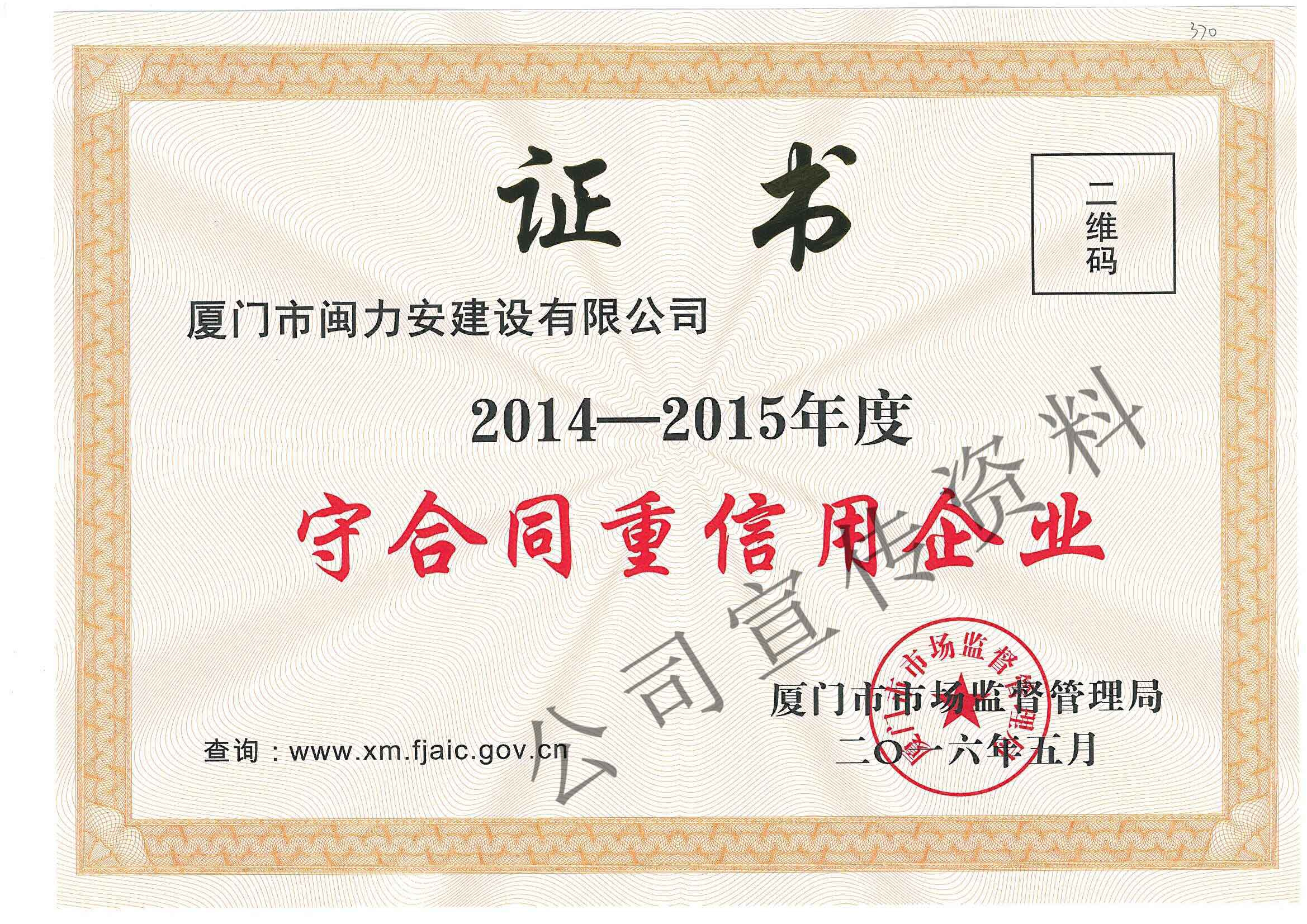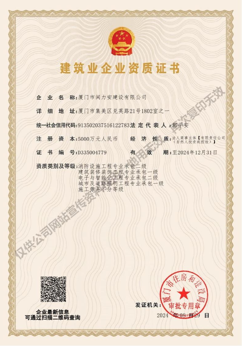 廈門市閩力安建設(shè)有限公司成立于2003年,公司取得市政公用工程施工總承包貳級、建筑裝修裝飾工程專業(yè)承包壹級、城市及道路照明工程專業(yè)承包壹級、電子與智能化工程專業(yè)承包貳級、消防設(shè)施工程專業(yè)承包貳級、電力工程施工總承包叁級、建筑機電安裝工程專業(yè)承包叁級、輸變電工程專業(yè)承包叁級、環(huán)保工程專業(yè)承包叁級、照明工程設(shè)計專項甲級、建筑裝飾工程設(shè)計乙級、施工勞務(wù)等資質(zhì)的綜合型企業(yè),公司于2013年通過了ISO9001質(zhì)量體系認證,ISO14001環(huán)境管理體系認證,OHSAS18001職業(yè)健康安全管理體系認證。